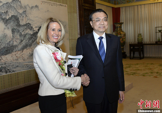 2014年1月13日,中国国务院总理李克强在北京中南海紫光阁会见了美国《科学》杂志主编玛莎·麦克纳特一行。(资料图)中新社发 刘震 摄
