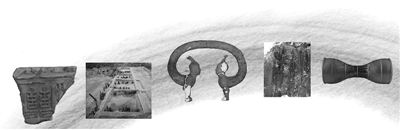从左至右为新安县汉函谷关遗址出土的“关”字款铭文砖、渭桥遗址发掘现场、隋炀帝墓出土的双人首蛇身俑、石渠县发现的吐蕃时代石刻、景德镇南窑唐代窑址出土的酱釉腰鼓。