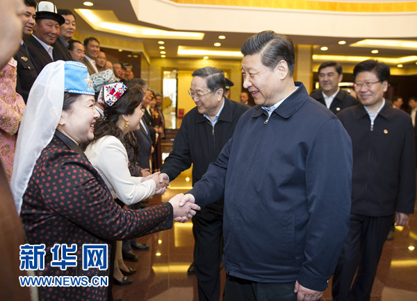 4月30日上午10时许,习近平和中共中央政治局常委、全国政协主席俞正声,在中共中央政治局委员、新疆维吾尔自治区党委书记张春贤和自治区政府主席努尔·白克力陪同下,来到新疆迎宾馆10号楼会见厅,接见新疆28名劳动模范和先进工作者、先进人物代表,同他们亲切握手、合影留念,之后同他们进行了座谈。