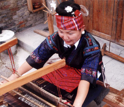苗族的苗绣有着悠久的历史,它的纹样绣艺是靠苗族女性“母女相传,邻亲传授”世代传承,渗透着当地的民间民俗风情文化。最初学绣时,吴通英也是和当地苗族妇女一样,只是为了自穿衣服的装饰织绣。但随着生活经验的增长,有机会参加了各种社会活动,受到了教育,开阔了视野,增长了智慧,也启发了她的许多许多灵感。特别是改革开放以来,自上世纪八十年代开始,封闭的苗家山寨,迎来了国内外的来宾,苗绣品也像其它商品一样走入市场,受到人们的喜爱。这虽然是很好的事情,可吴通英却渐渐的发现,市场上卖得苗族服饰、苗绣品,虽丰富多彩、五花八门,但绣工、绣艺不免令人担忧。人工绣、机子绣的绣品混杂之中,真真假假,品类不等。做生意的人只看到钱,难守诚信。