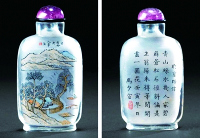 内画鼻烟壶一般被划分为京、冀、鲁、粤四大派别。其中,“冀派”出现较晚,但是发展却最快。据王志江介绍,内画鼻烟壶产生最早的应属“京派”,他师父的爷爷马少宣最早就是为皇家作画,而“马家”内画如今在海外最为出名。“马家”的绘画风格文人气息很浓,一般为一面绘画一面书法,而且书法大部分为欧体字,这便要求具有很强的书写功夫。除“马家”外,“京派”中的叶仲三大师艺术成就也极高,“叶家”的绘画内容多涉及花鸟、人物、草虫等,以色彩鲜艳、浓烈著称。此外,还有周乐园和丁二仲两位大师,但他们的传人不多,所以随着两位老艺人的去世,他们的手艺在民国之前也失传了。王志江的两位师傅,一位是马少宣的嫡孙马增荃,另一位是叶仲三的嫡孙女叶淑英,由于两位师傅关系非常好,所以同收了一位徒弟,而王志江也成了马家现在唯一一个外姓弟子。