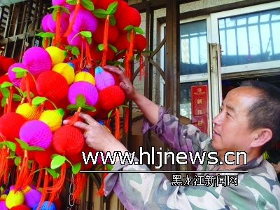 17日,记者在道外区丰润街、南小六道街、南八道街看到,店主们把漂亮的纸葫芦挂在门前招揽生意。记者随后来到了南小六道街94号“葫芦大王”邹宝忠的作坊,这是一家集印染、制作、组装全套制作流程于一体的纸葫芦作坊。