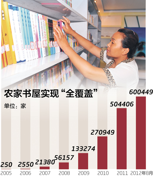 农家书屋工程是社会主义新农村建设的文化工程,也是党中央实施的文化惠民五大重点工程之一,2005年在甘肃、贵州等西部地区试点,2007年纳入党和政府民心工程、德政工程,在全国广大农村全面推开,受到了基层组织和广大农民群众热烈欢迎和积极参与。截至2012年8月底,农家书屋已覆盖全国具备条件的行政村,提前三年完成了“农家书屋村村有”的任务。全国共建成达到统一规定标准的农家书屋600449家,投入资金180多亿元,共计配送图书9.4亿册、报刊5.4亿份、音像制品1.2亿张、影视放映设备和阅读设施60多万套,丰富了农村的文化生活。农家书屋工程建设还带动了社区书屋、职工书屋、农民工书屋、连队书屋的建设。到目前为止,基层书屋也达到9万多家,缓解了基层群众读书难、看报难的矛盾。
