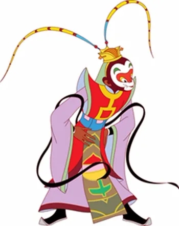 因此二十年后创作《大闹天宫》时,当万籁鸣终于看到一个民族化的孙悟空向他走来,他的激动之情溢于言表。这个孙悟空不再是米老鼠了!只见他上身一件鹅黄色短衫,下身一条大红裤子,脖子围一条围巾,腰系灿烂金黄的虎皮短裙,足蹬薄底快靴,手舞闪闪发光的金箍棒,这个孙悟空造型一部分来自于民间京剧脸谱,头上是模仿白羊肚毛巾的陕北农民形象,真可谓神采风扬、勇敢矫健!