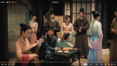 《大宋宫词》将这段故事嫁接于宋代,同样被宋太宗怀疑“谋政”的赵廷美身上。剧中,《韩熙载夜宴图》的五个场景中均有赵廷美的身影,但曾念平又试图将其设计为看似“一镜到底”的画面,于是便采用了运动+镜头合成的电影拍摄方式,即画面中有宫女端着盘子、歌舞伎在演奏跳舞、赵廷美宴请宾客等多个场景,他通过镜头的运动,让每个场景无缝衔接,看似就是一个场景。