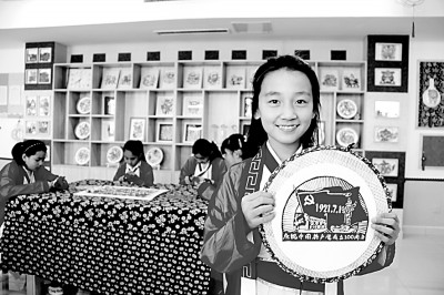 山东淄博高青县实验小学学生展示自创的建党100周年剪纸作品。张陶摄/光明图片