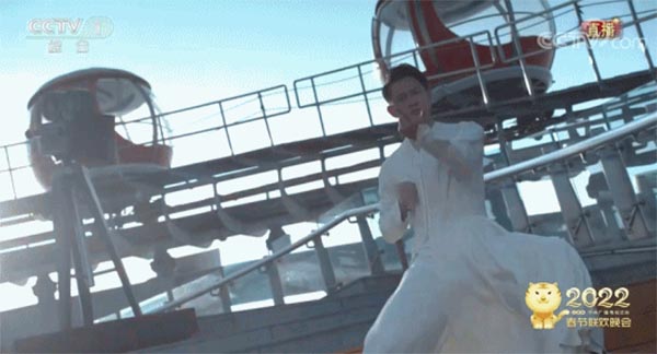 不只此青绿,还有喜庆的洋红朱红砖红,也有“金面”惊艳、白净素雅,文学、戏剧、影视、音乐、书画、曲艺、舞蹈、杂技等艺术,如烟花与雪花竞相绽放。其中《景观太极》突破舞台空间限制,三位武术冠军在上海、重庆、广州四座云端高楼闪转腾挪,一招一式划动城市天际线,行云流水诠释“天人合一”的文体内涵。《冰雪闪亮中国年》跃动冬奥交响音符;北京冬奥会吉祥物“冰墩墩”“雪容融”在经典的《溜冰圆舞曲》中巡看壮美的冬奥场馆。央视春晚迎来40周年,这一对美好生活向往的家国叙事表达,为中华民族“想象共同体”打开一扇五彩心窗,让我们“年”在一起。当然,在配色越趋融和而不浮华的态势中,群舞服饰如能加强艺术设计将更超脱艳丽杂乱。