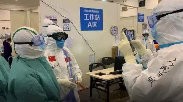 武汉首批最大规模方舱医院东西湖方舱医院休舱现场,人民日报记者吴姗(右)见证最后一批转院患者出舱。