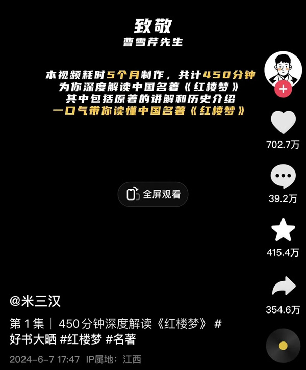 正如那条450分钟的视频开头所引用的诗句,“都云作者痴,谁解其中味?”对于创作者而言,在这个网络数字化的时代,通过这样的传统文学与现代传播方式的深度交融,既能满足了观者的视觉与求知需求,又能为自己提供表达自我、分享热爱的新途径,何尝不是一种乐趣呢?