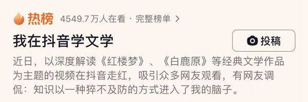 2024年4月,抖音发布了《2024抖音读书生态数据报告》。报告显示,抖音上时长大于等于5分钟的读书类视频总数量达1143.43万个,收藏量达3.91亿次;读书书评相关内容共有541万个,总评论量为2306万次。泛知识类视频正在变得越来越长,看的人越来越多,也从另一个侧面凸显了观者对深度内容的高度认可。同时,互动功能带来的社交属性,又进一步扩大了知识和文化传播的受众范围,让优秀内容更容易“出圈”。