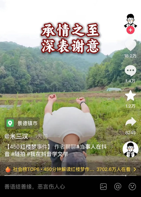 6月12日,@米三汉发布短视频回应。他说,希望自己讲原著能再有条理一点,幽默一点,让更多的朋友愿意了解咱们的名著。“传统文学妙趣横生的,我们口中的不感兴趣,可能只是因为了解得少而已。所以我万分感谢每一个愿意来看视频的朋友,你们就是米三汉存在的意义。承情之至,深表谢意。”