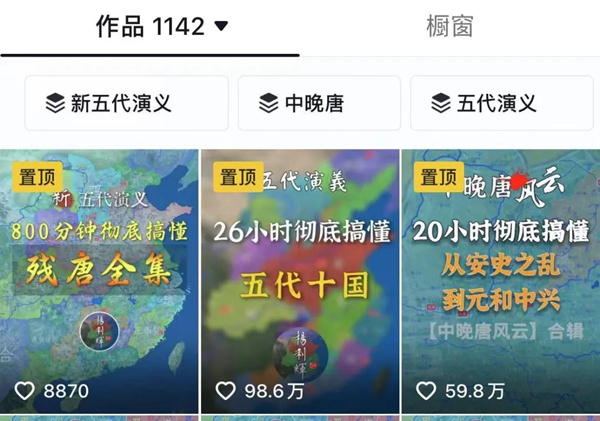 博主@杨利辉在2023年就发布过“800分钟彻底搞懂残唐全集”“26小时彻底搞懂五代十国”“20小时彻底搞懂从安史之乱到元和中兴”的超长视频,均收获热烈反响。此外,博主@一只萧包子也通过“240分钟深度解读《白鹿原》”“55分钟深度解读《百年孤独》”等长视频作品,有效扩大了其粉丝基数。