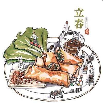 “春吃芽、夏吃瓜、秋吃果、冬吃根”,顺应天时、饮食有节,是中国传统饮食文化的重要理念。中国养生学亦讲究“护阳”与“疏肝”。新发的春芽如竹笋、香椿、豆芽、韭菜、荠菜、菠菜等,含着泥土的芬芳与生命的能量,有疏清体内郁积、生发五脏新气的功用。以此为食材做成春卷、春饼等,成为人们立春时节重要的饮食仪式。这些食物虽然简单,却以新鲜的滋味,撩拨着人们心头萌动的清浅春意。