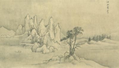 《江山雪霁图》的整体气息与上图基本一致,只是所表现的景致不同。此图描绘的是雪景,因此在技法上大量使用了渲染。天空、山脚、江面,都晕染得十分匀净,增强了画面的整体感,也烘托出了“雪霁”的气氛。