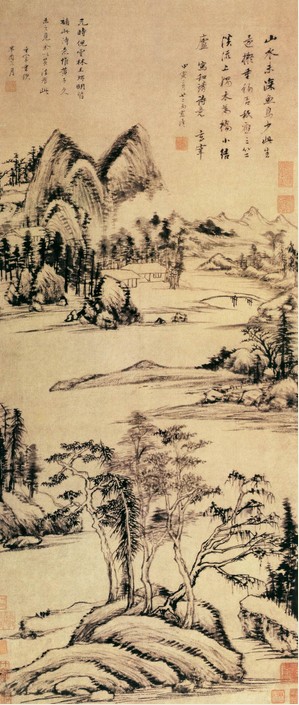 董其昌(1555—1636)明代书画家。字玄宰,号思白、香光居士。华亭(今上海松江)人。万历十七年进士,授翰林院编修,官至南京礼部尚书,卒后谥文敏。擅画山水,师法董源、巨然、黄公望、倪瓒,笔致清秀中和,恬静疏旷;用墨明洁隽朗,温敦淡荡;青绿设色古朴典雅。以佛家禅宗喻画,倡“南北宗”论,为“华亭画派”杰出代表。其画及画论对明末清初画坛影响甚大。书法出入晋唐,自成一格,能诗文。存世作品有《岩居图》《秋兴八景图》《昼锦堂图》等。著有《画禅室随笔》《容台文集》等,刻有《戏鸿堂帖》。