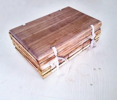 在染旧的纸张风干、装订完成后,便是古籍的切口、封面、装订线以及函套等的做旧。张波举例说:“古籍的下切口颜料用得比较多,因为一般都是书籍的外边比较旧,可以用茶叶水加上赭色或褐色颜料混合起来,用排笔刷上,做完后就能达到深色感觉,就像是被水泡过一样。”其他还有打磨书角、书签条、烧断或剪短装订线等多个细节要处理。