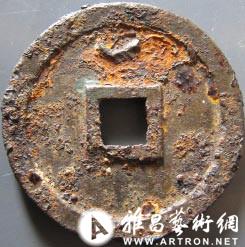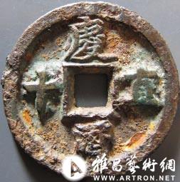 是品“庆历直十”钱直径3 9.6毫米,厚约4毫米,重21.4克。“庆历”二字文字秀挺,“直十”二字字口间稍有流铜;背月纹,穿郭整齐,穿口有一定斜度,面宽而背窄,具有北宋铁母风格;锈色除铜绿外还有一层铁壳锈,开门入骨。它的发现进一步揭示了中国古钱的延续性、反复性和复杂性,足可补史阙和填钱谱之漏。