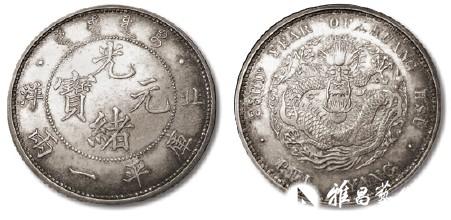 这枚“光绪元宝”北洋库平一两重36.73克,钱面:珠圈内汉文“光绪元宝”,圈外上环满文 四字,下环“库平壹两”,左右分别为“北”、“洋”二字,字上一星点。钱背为中心蟠龙图, 上下环英文,左为阿拉伯数字33,左右下侧各一圆点星。背景为光绪三十三年(1907年)北洋银 元局试铸清政府制定“银币分量成色章程”法定银元为库平壹两后,铸行“库平壹两”、“光绪元 宝”。该币不为市人接受,随即停铸。直至宣统二年又颁“币制则例”,规定以“元”为单位,重七 钱二分,不标重量。今实物所见,重量不尽一致,一般在35.1~37.6克之间。