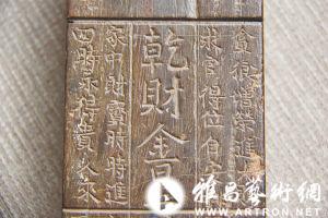 尺子正面平均划为8格,每格正中间自上而下阴刻4个繁体大字,分别是“乾财金星”、“坎病水星”、“艮离土星”、“震义木星”、“巽官木星”、“离劫火星”、“坤害土星”、“兑本金星”,左右两边各有两行小字,可连成一首打油诗似的七绝,对中间的大字进行阐释。如在“乾财金星”4字左右的文字是“贪狼增荣进大财,求官得位自安排,家中财宝时时进,四时永得贵人来”。尺的背面也对应有8格,上面的文字也是对正面文字的释义。