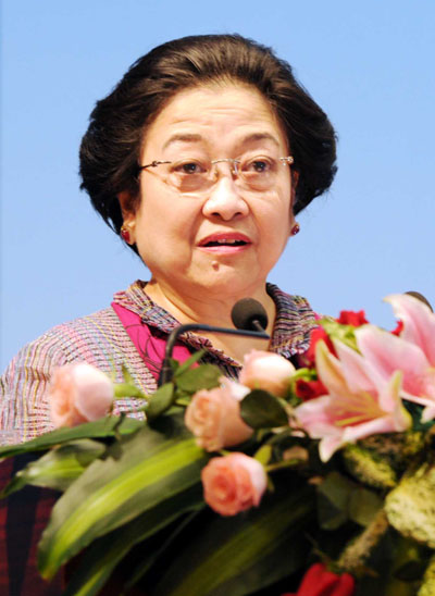 5月18日,由太湖文化论坛、中国文联、江苏省人民政府、中国人民外交学会共同主办的太湖文化论坛首届年会在江苏苏州开幕。图为印度尼西亚前总统梅加瓦蒂出席开幕式并致辞。姚永强 摄