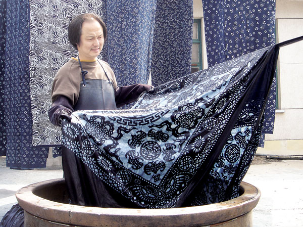 吴元新在染色[图片由南通蓝印花布博物馆提供]