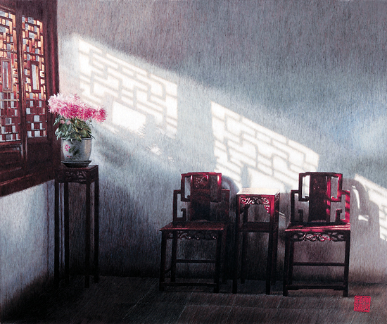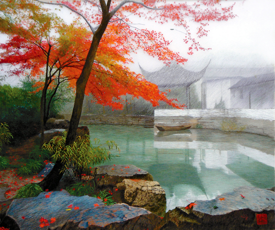 2005年,我在苏州专程参观姚建萍刺绣艺术馆。艺术馆位于幽静典雅的木渎古镇,一路上青石小径,小桥流水,家家枕河,临水而居,让我领略了小镇含蓄的美以及江南水乡的灵气——在一段水路之后,伴随着船娘自编自唱的水乡小调,来到了姚建萍刺绣艺术馆。在那里,我看到了更多姚建萍的刺绣作品,更让人耳目一新,大开眼界。她在继承苏绣传统的基础上,敢于创新,不但重视刺绣技艺的创新和提高,更重视刺绣本身艺术修养的提高,对于刺绣对象,艺术内涵的理解,在色彩、光影、透视等方面都能比较精确地把握、规划。作品《沉思》也令我沉思良久,那是根据意大利摄影师焦尔乔·洛迪所拍的一张周总理的肖像,以画定绣,在平乱交织的针法当中,融合了中国画的水墨神韵和西洋画的光线透视,生动表现出周总理深沉凝重的思考和展望,站在那幅绣品前,不经意地就让我想起曾经在总理身边工作过的日日夜夜。