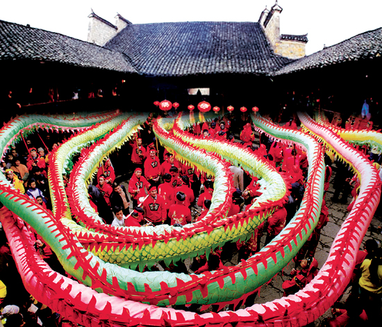 寨英人喜舞滚龙,每逢传统喜庆节日,街上、河中、人家的庭院,广袤的原野,都腾挪着滚龙游弋和翔飞的身姿,人们的眼前便幻化成了龙的世界。