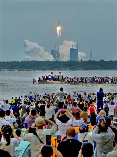 2021年4月29日11时23分,中国“长征”5B运载火箭搭载中国首个空间站核心舱“天和”号在海南的文昌航天发射场发射,附近游客用手机、相机记录下这一刻。