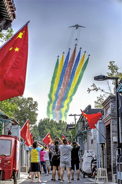 2019年10月1日,北京宣武门北新华街东侧胡同,市民用手机拍摄参加国庆70周年阅兵的空军战机。