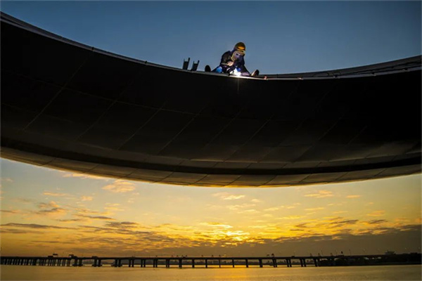 2020年12月26日,夕阳下的深圳前海欢乐港湾建设工地上,一名工人正在进行电焊作业。