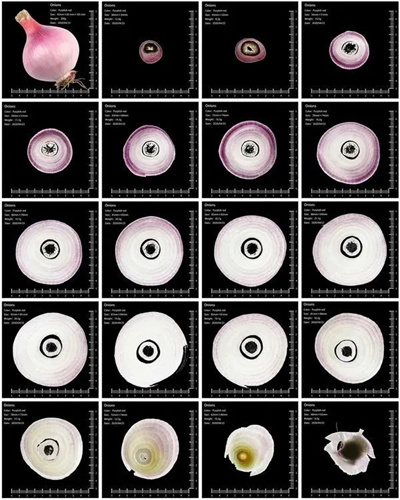 灯椒、番茄、佛手瓜、小南瓜、藕、洋葱,我选择的这组果蔬,因为它们直径大约都在10cm左右。后期参照CT片的内容,配上文字和图表,犹如一组“蔬果CT”。