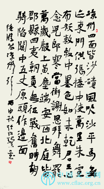 张改琴的行草也颇具特色,如果说我们在她十年的作品集中看到的行草虽具功力和个性,但却有拘束、生涩之感的话,而此后则一两年一变,台阶上得很快,且快而好,前后对比,使人惊诧。早年其行草,多以魏碑为基础,由清人魏体行书发轫,得邓石如、何绍基、赵之谦及康有为意,取其沉厚、朴拙之气。后直入晋人,以晋人之气韵融入并化解魏之体态和精神,此确为明智之举。而我在其大量行草作品中,还发现颜真卿对她的重要影响,每个字结体的开张,右折笔画的外拓,使其作品于潇洒之中又透出厚重,这在其最为狂放的行草作品中也显示出颜对其的影响。就目前的作品看,晋人,尤其王献之更为开张、洒脱的意味是其主要取法之源泉,而其间隐约透露出魏之沉郁、颜之厚重、杨凝式之萧散以及明人诸家之意趣,自由奔放,不衫不履,以情驭笔,情浓意足。但她又能在情绪爆发中显示出理性的控制,笔墨狂放中又蕴涵着女性特有的温润。最近我看到她大量或八尺长联,或盈尺手札,或横批手卷,已将前人经典中的技巧、意味不露痕迹地融为一体,成为独有的张氏风格,如“逢人觅诗句,留客听清泉”“朝寻晋字唐诗韵,暮听春雷夏雨声”联,宗炳《画山水序》、“叙画宋王微撰”横批手札,李白“江城如画里”、杜牧“江涵秋影雁初飞”、杜甫“诗二首”中堂等,可谓之近年的代表之作,反复品味,颇为感人,行草书已成为她的主打书体。此外,我还看到一部分她的似小楷而实为行楷或者说草楷的作品,篇幅均不大,然极精美,结体、线条近钟繇和王宠,开张、飘逸、灵动,骨力洞达,似平而奇,至柔至雅,如陆游词《钗头凤》、李清照词《蝶恋花》、柳永词《八声甘州》等,当可与古人雁行。