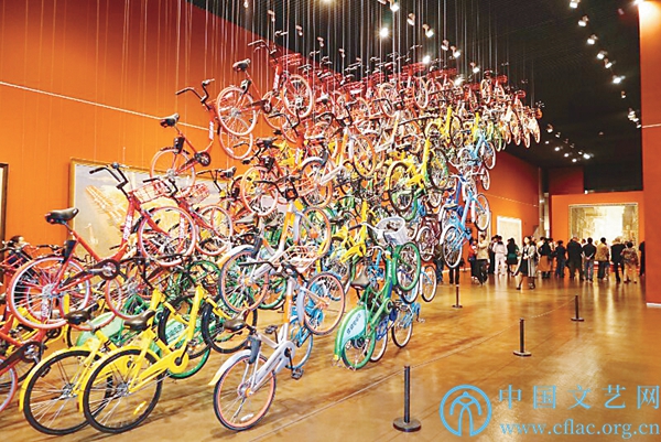 展出作品的创作年代跨度很大,既有上世纪40年代在枪林弹雨中诞生的作品,如黎鲁的《欢迎五旅南下》,就是艺术家本人在新四军的行军途中用枣木版刻的;上世纪五六十年代,艺术家都投入到创作新中国农业工业建设的题材中,有陈佩秋的《饱饱金珠胜似春》、陆俨少的《新安江上》、谢之光的《万吨水压机》、吴湖帆的《第一颗原子弹爆炸》等表现新中国工农业建设的名作;又有艺术家因为这次展览受约创作的作品,比如《天路》。艺术家李乾煜带领学生把街上停放着的共享单车骑到了中华艺术宫里,租赁公司发现共享单车流向一个地方,找上门来问明原因,当他们得知这是一件重要作品时,主动提出“以旧换新”,以带给展览更好的呈现效果。96辆彩色的共享单车悬挂在展厅里,如同一道彩虹奔向未来。在展览期间,观众扫描展签上的二维码,就会有一辆共享单车转动起来。正如李乾煜说的:“我想让装置有互动性,增加趣味性,96辆车代表中国共产党96年砥砺前行,我们要继续把这种精神在新时代中发扬下去。”