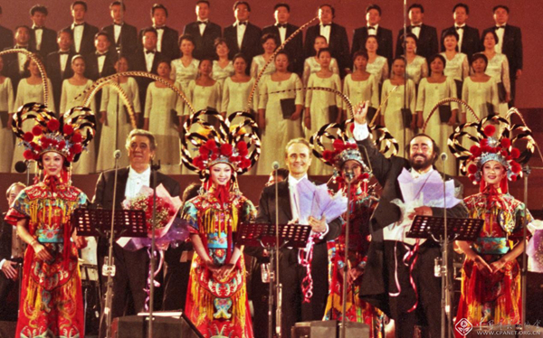2001年6月23日夜,享誉世界的三大男高音歌唱家卢恰诺·帕瓦罗蒂、普拉西多·多明戈、何塞·卡雷拉斯,放歌北京紫金城,“为中国喝彩,为奥运放歌”。王文扬 摄影 中国