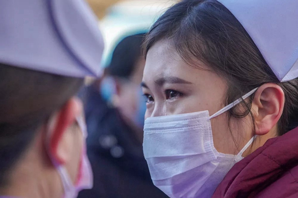 1月26日,在吉林省援助湖北省抗击新型冠状病毒感染肺炎医疗队出征仪式现场,一名护士送别医疗队同事时落泪。来自吉林省12家三级甲等综合医院的137名医疗队员从长春出发前往湖北,支援疫情防控工作。