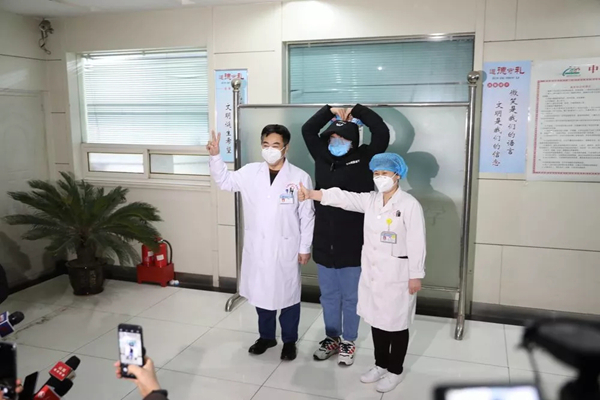 1月29日,山西省首例新型冠状病毒感染的肺炎患者在省级医疗救治专家组的指导和省级定点太原市第四人民医院医护人员的治疗下,已符合治愈标准,正式出院。这是治愈患者与治疗医生一起与记者见面。