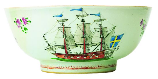 瑞典西方古董公司收藏的清朝乾隆年间粉彩描金帆船纹大碗