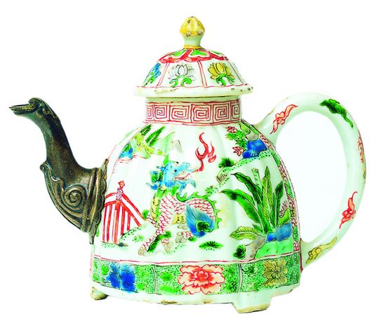瑞典西方古董公司收藏的清朝康熙年间五彩瑞兽纹瓜棱执壶