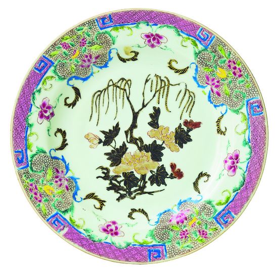 瑞典西方古董公司收藏的清朝乾隆年间粉彩描金牡丹垂柳纹折沿盘