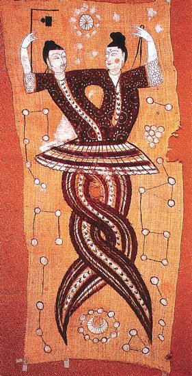 褚兰墓盖的莲花纹周围有伏羲女娲相环绕而飘飘起舞,象征阴阳交感、化育万物。