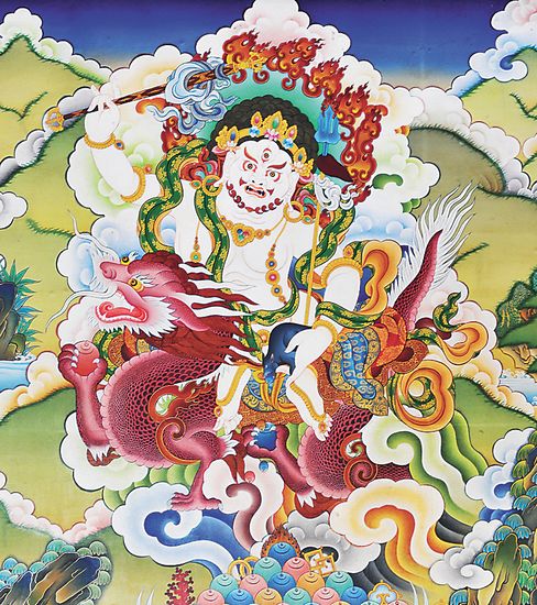 其二,中国古代传说中的龙,能够升天入地,沟通天人;能为神仙乘驭,来往于天地之间。如黄帝乘龙升天,颛顼、帝喾、启亦乘龙往来。而印度佛教中的龙则没有这种神性。大神乘骑的是金翅鸟,如古印度人的天神毗湿奴常骑在金翅鸟上飞行。佛教中的文殊菩萨乘的是狮子和孔雀,或坐白莲台;普贤菩萨乘的是六牙白象,或坐青莲台。