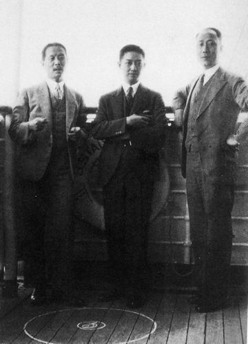 齐如山(左)与梅兰芳(中)、张彭春(右)在赴美的船上