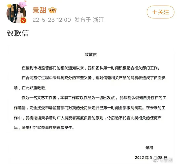 随后景甜在其微博发布了致歉信,表明会配合相关部门工作,并杜绝此类事件再次发生。