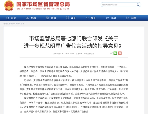 为了规范明星广告代言活动,今年10月,按照中央宣传部文娱领域治理有关工作部署,市场监管总局会同中央网信办、文化和旅游部、广电总局、银保监会、证监会、国家电影局等七部门联合印发《关于进一步规范明星广告代言活动的指导意见》。
