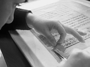 用心、手、眼,去精心对待每一页残破苍老的脆弱纸张,就像面对着扑面而来的滚滚历史烟尘。每当面对一小片脆得几乎一触即化,已有几百岁的书页,省图书馆特藏文献部古籍修复组组长梁晋保的心就提了起来。每到这时他就屏住呼吸,用细小的镊子捏住几毫米见方的小纸片,再用毛笔尖仔细地刷上特别熬制的糨糊,小心翼翼地贴在书页的残破处。他说,自己修复过最珍贵的一本古籍,是距今约400年的《诸器图说》,“这部善本记载着当年各种农具器械和农业发展状况。而馆里现存的《碛砂藏》源自南宋,已有800多年历史,堪称‘镇馆之宝’。从宋到元共经历了107年才刻印完,当年康有为来西安讲学时就曾见到这部藏书,差点据为己有”。