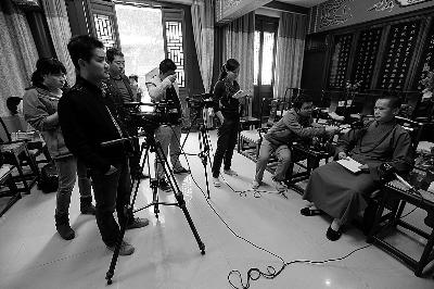 兴教寺宽树法师在闻慧堂接待赶来的记者