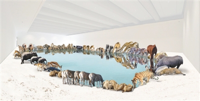 我想在展厅里创造一个乌托邦的世界。有一个蓝色的沙漠,有99只真实大小的动物围着一摊蓝色的水,它们都在静静地喝水。这件作品叫《遗产》,传递了一个非常乌托邦的理想世界以及背后的悲伤。