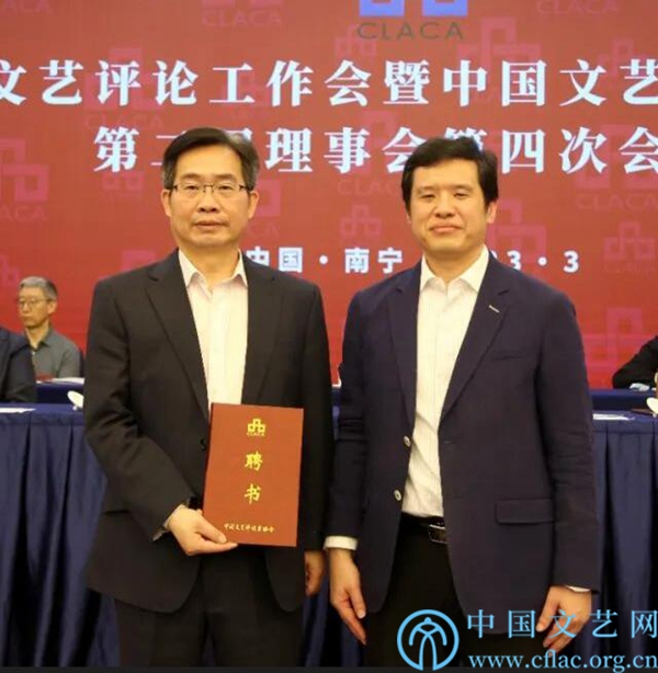 3月15日,全国文艺评论工作会暨中国文艺评论家协会第二届理事会第四次会议在广西南宁举办。图为中国评协副主席兼秘书长、中国文联文艺评论中心主任徐粤春为中国评协副秘书长、中国文联文艺评论中心副主任、中国评协职业道德建设委员会主任袁正领颁发聘书。图片由主办方提供。