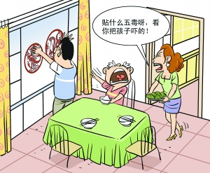 再看不远处的剪纸摊位,制作剪纸的老先生特地准备了几幅传统五毒图案的剪纸。一位姑娘拿起剪纸仔细端详,立即花容失色:“这上面怎么都是毒蛇、蝎子?贴在家里多吓人啊!”老先生赶紧解释,端午节前贴五毒剪纸是老传统,端午当天正午时分撕下剪纸,就算是祛病驱毒了。围观的顾客这才恍然大悟。