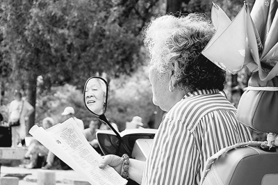 北京一处公园里,一位老人正坐在代步车上阅读。资料照片